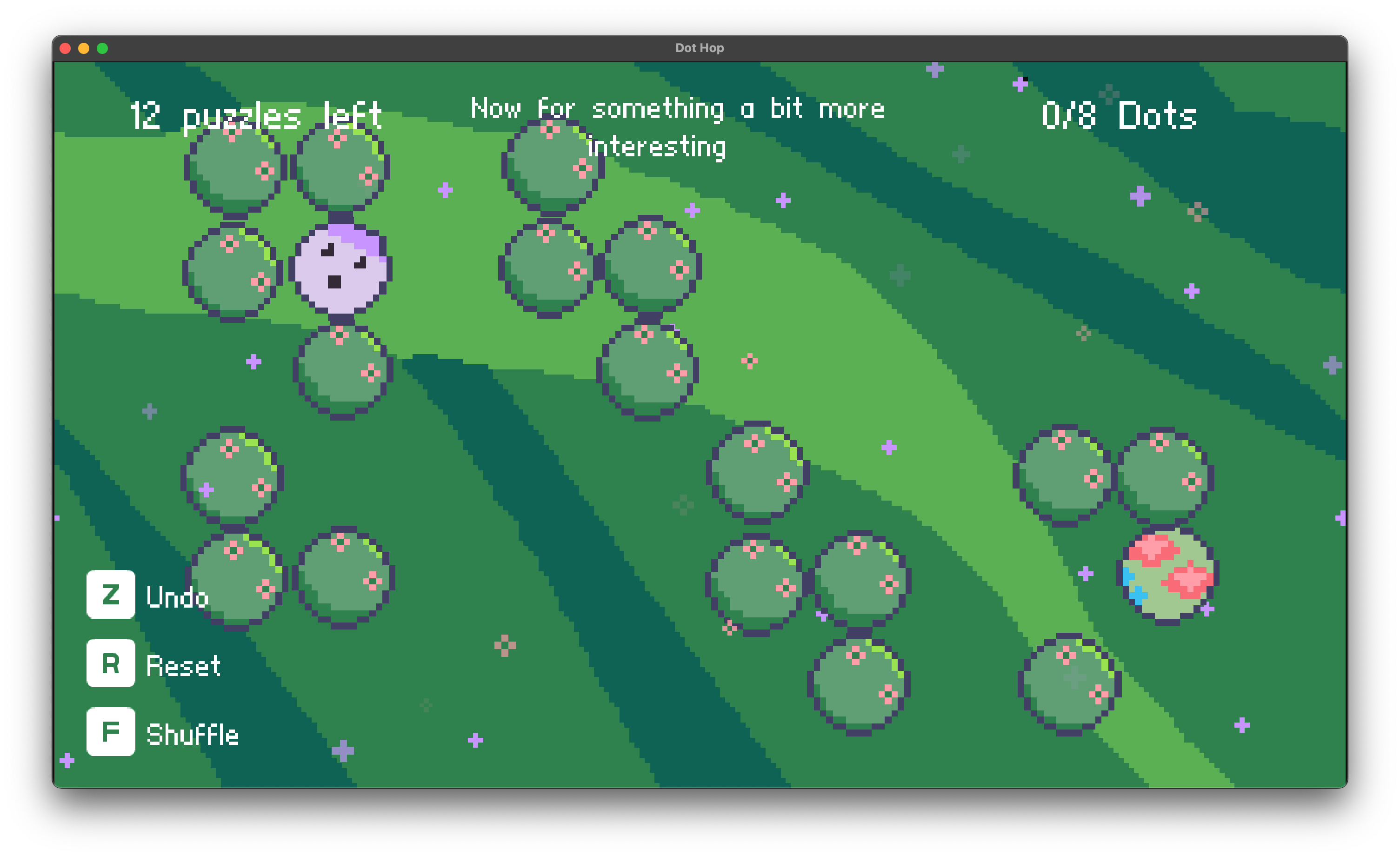 Dot Hop has 72 puzzles and over 1000 dots to be hopped. The puzzles have been created by hand, but a generator is in the works, along with more mechanics and game modes.